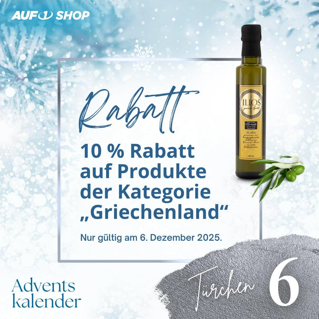 Zum Nikolaustag öffnen wir heute ein kulinarisches Türchen im AUF1 Shop Adventskalender: 10 % Rabatt auf alle Produkte der Kategorie „Griechenland“ – vom extra nativen Olivenöl bis zu köstlichen Honig- und Teespezialitäten.