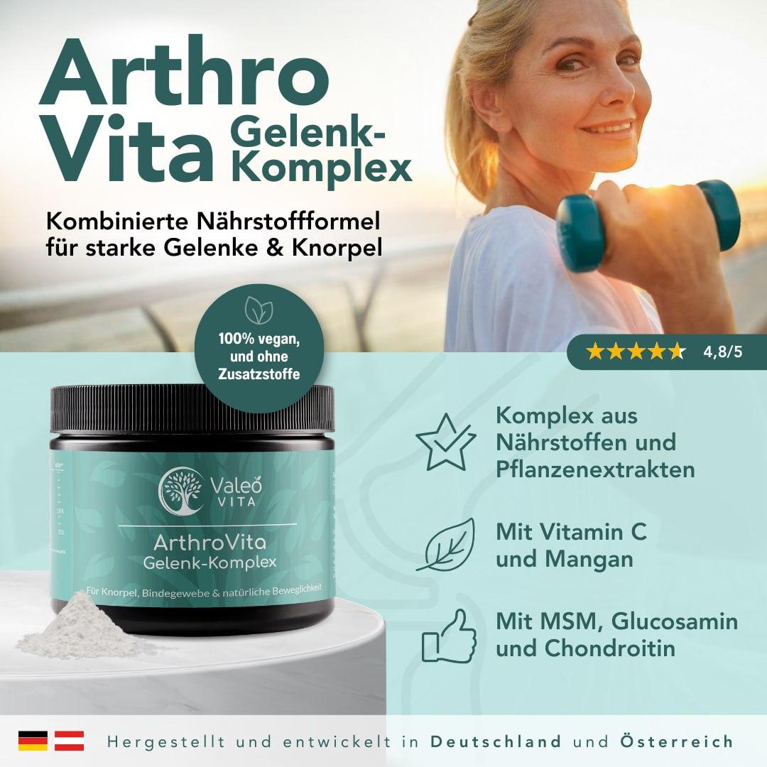 ArthroVita – Gelenk-Komplex wurde entwickelt, um den Körper in Phasen höherer Belastung oder zunehmenden Alters zu unterstützen. Die Formel kombiniert ausgewählte Mikronährstoffe, Aminosäuren und Pflanzenextrakte. Zu den enthaltenen Stoffen gehören MSM, Glucosamin, Chondroitin, Hyaluronsäure, Hagebuttenextrakt, Vitamin C, Bor, Mangan und Glycin.