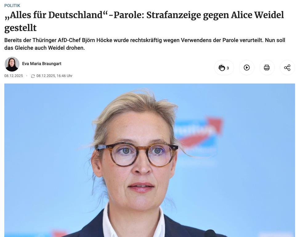 Eine linke Gruppe hat daraufhin Strafanzeige gegen Weidel gestellt wegen Verwendung verfassungfeindlicher Kennzeichen. Obwohl die AfD-Chefin den Satz eindeutig nur zitierte und die Absurdität hervorhob, dass man in Deutschland für diese Aussage überhaupt juristisch belangt werden kann, wird die bloße Erwähnung der Parole „Alles für Deutschland“ bereits als Straftat ausgelegt.
