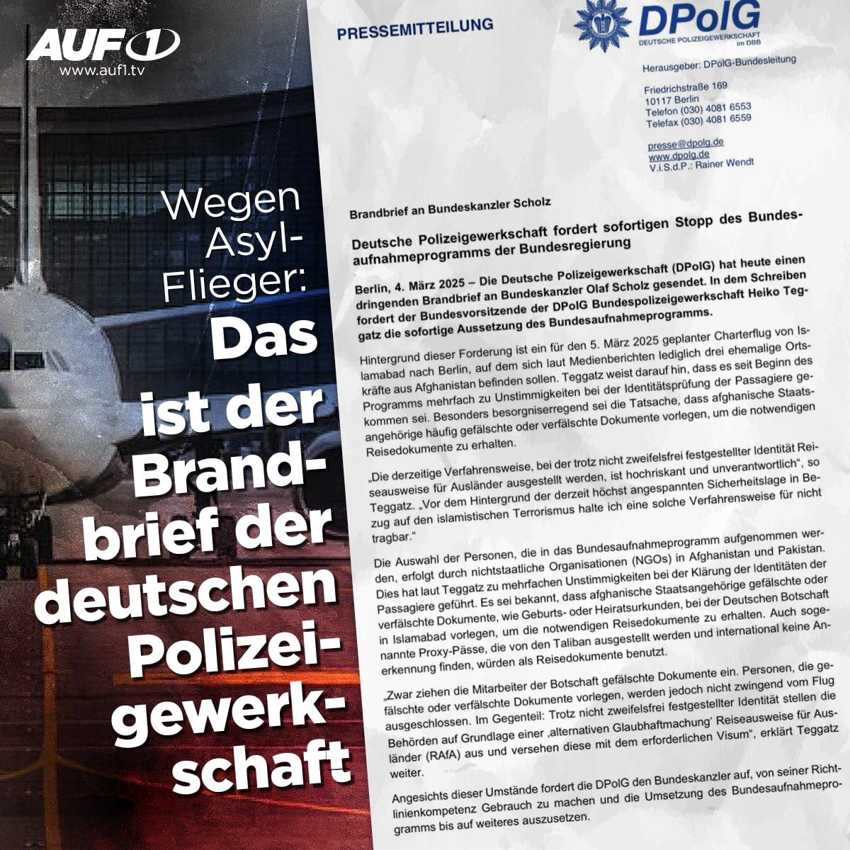 „Wir fordern den sofortigen Stopp des Bundesaufnahmeprogramms“, schreibt Manuel Ostermann, stellvertretender Bundesvorsitzender der Deutschen Polizeigewerkschaft, auf seinem X-Kanal. Dort veröffentlichte er auch den Brandbrief seines Kollegen Heiko Teggatz, gerichtet an Noch-Bundeskanzler Olaf Scholz (siehe Grafik). Auslöser des Protests sind die Asyl-Flieger aus Afghanistan und die angespannte Sicherheitslage in Deutschland. In dem Brandbrief heißt es: „Die Praxis, Reiseausweise trotz ungeklärter Identität auszustellen, ist hochriskant und unverantwortlich.“