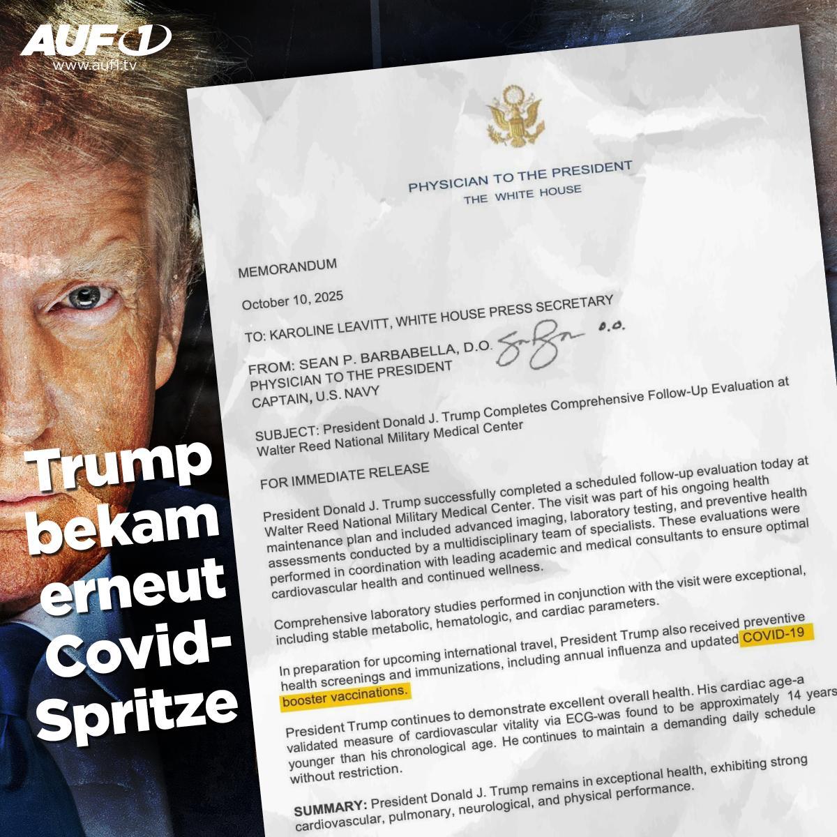 Das Netz rätselt. Die gestern veröffentlichte Gesundheitsbescheinigung von US-Präsident Donald Trump spaltet derzeit die User im Netz. Neben dem Ergebnis, dass sich Präsident Donald Trump "exzellenter Gedundheit" erfreut, fällt in dem Schreiben eine Passage besonders auf: Trump wurde erneut gegen Covid geimpft! In dem Schreiben heißt es wörtlich: „Im Hinblick auf die bevorstehenden internationalen Reisen erhielt Präsident Trump präventive Gesundheitsmaßnahmen und Impfungen, einschließlich einer jährlichen Grippe- und einer aktualisierten COVID-19-Auffrischimpfung.“