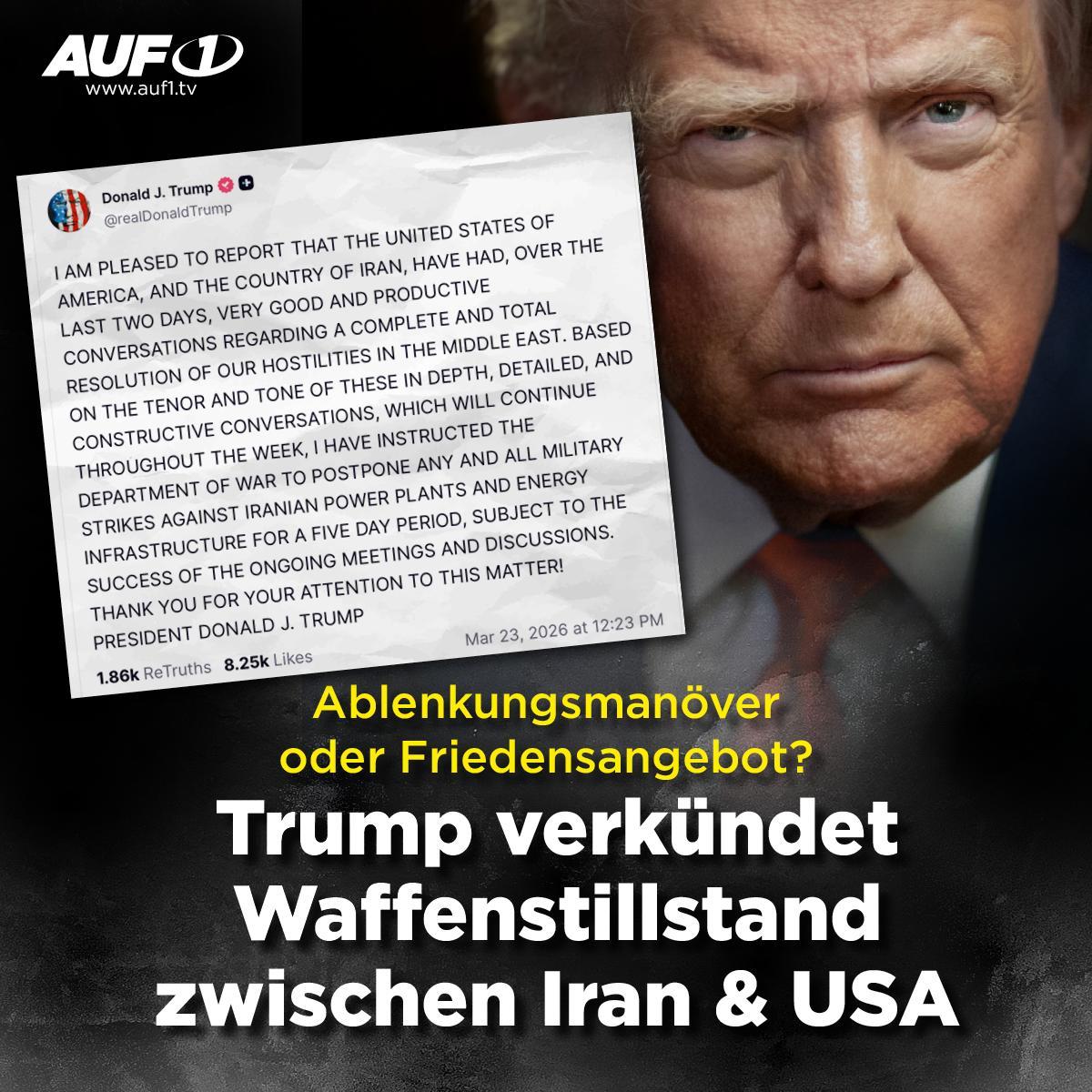 Paukenschlag im Nahost-Konflikt. Während Israels Premierminister Benjamin Netanjahu noch am Sonntag Europa und die restliche Welt zum aktiven Kampf gegen den Iran aufrief, AUF1 berichtete, verkündete US-Präsident Donald Trump vor wenigen Minuten auf seiner Social-Media-Plattform „Truth Social“ einen 5-tägigen Waffenstillstand und spricht von „sehr guten und produktiven Gesprächen“ mit dem Iran, die Kampfhandlungen im Nahen Osten einzustellen.