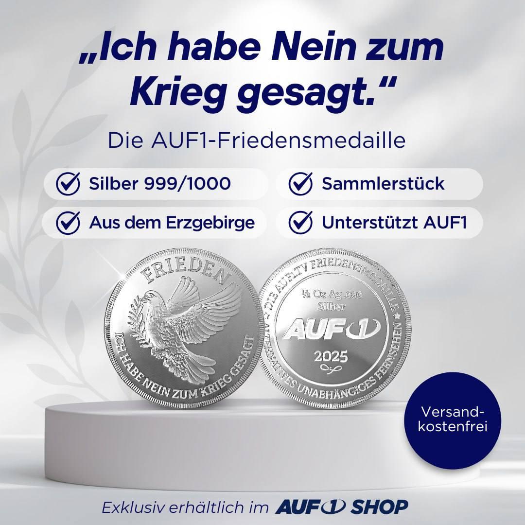 Die AUF1-Friedensmedaille mit der klaren Botschaft: „Ich habe Nein zum Krieg gesagt.“ Ein Ausdruck persönlicher Überzeugung und ein bleibendes Erinnerungsstück. Aus Feinsilber (999/1000) gefertigt im Erzgebirge. Die Vorderseite ziert eine fein geprägte Friedenstaube, auf der Rückseite trägt die Medaille das AUF1-Logo und das Prägejahr 2025.