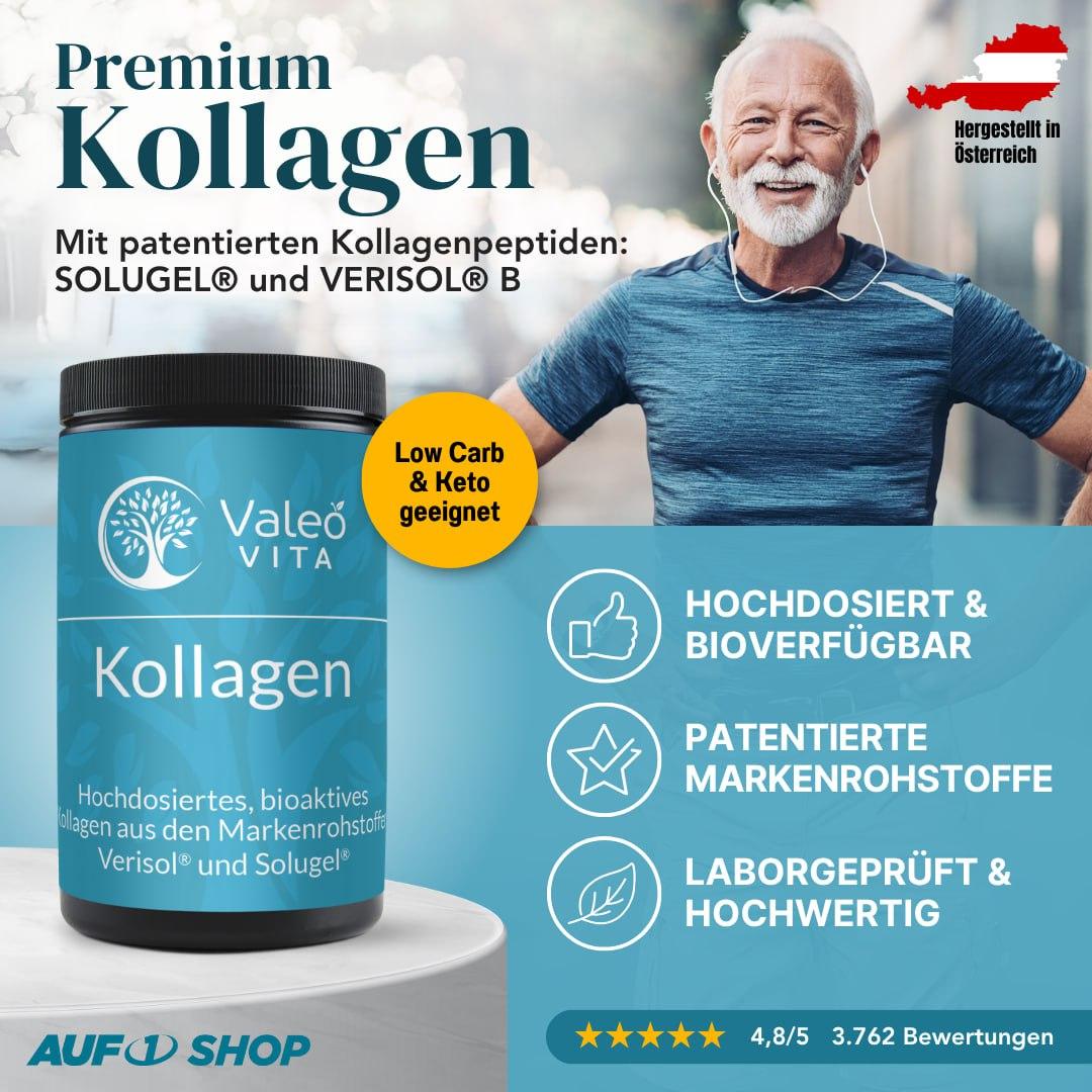 Kollagen von Valeo Vita ist gut verträglich, wird schnell vom Körper aufgenommen und lässt sich leicht in Wasser, Säfte und Kaffee einrühren. Das Pulver ist eiweißreich und gleichzeitig kohlenhydrat- und fettfrei, also auch ideal für eine Low Carb Ernährung.