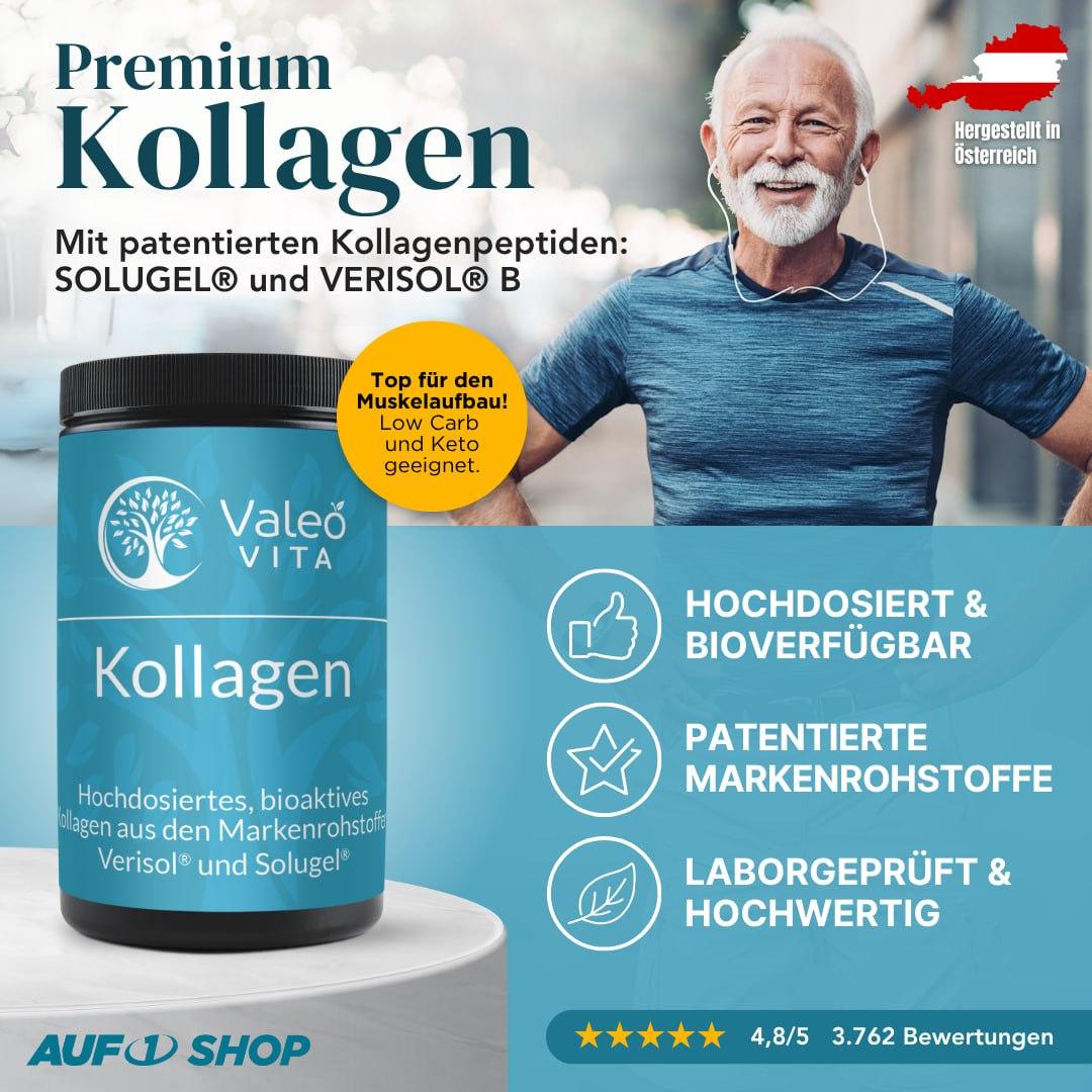Kollagen von Valeo Vita ist gut verträglich, wird schnell vom Körper aufgenommen und lässt sich leicht in Wasser, Säfte und Kaffee einrühren. Das Pulver ist eiweißreich und gleichzeitig kohlenhydrat- und fettfrei, also auch ideal für eine Low Carb Ernährung.