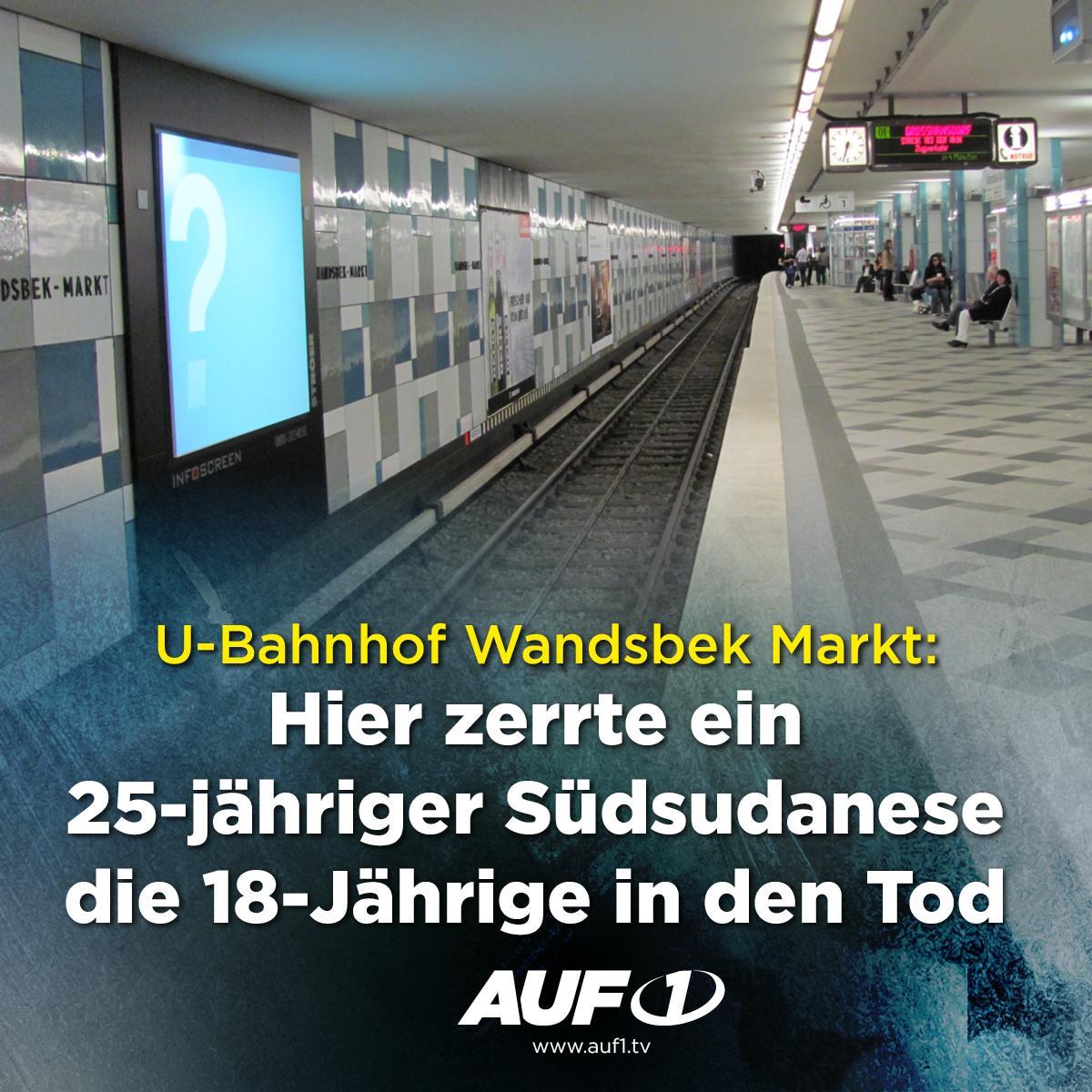 Schreckliche Szenen am Hamburger U-Bahnhof Wandsbek Markt. Ein 25-jähriger Südsudanese packte gestern Donnerstag gegen 22:07 Uhr eine am Bahnsteig wartende 18-Jährige und zerrte sie mit sich ins Gleisbett – direkt vor die einfahrende U-Bahn. Beide starben noch an der Unfallstelle.