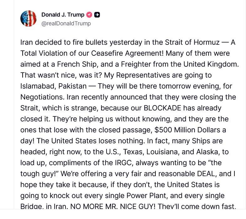 US-Präsident Donald Trump hat in einem Post auf seiner Plattform Truth Social neue Verhandlungen mit dem Iran angekündigt. Bereits Montagabend würden seine Unterhändler in Pakistan eintreffen. Hintergrund der Gespräche soll die erneute Schließung der Straße von Hormus durch Teheran sein. Die iranische Regierung hatte die Blockade der strategisch wichtigen Meerenge am Samstag wieder aufgenommen, nachdem die Amerikaner ihrerseits iranische Häfen blockierten. Sollte der Iran nicht auf die US-Forderungen eingehen, kündigte Trump eine neue Welle von Militärschlägen an. Wörtlich schrieb er: „Die Vereinigten Staaten werden jedes einzelne Kraftwerk und jede einzelne Brücke im Iran zerstören.“ Eine Reaktion der Mullahs zu diesen Äußerungen liegt noch nicht vor.