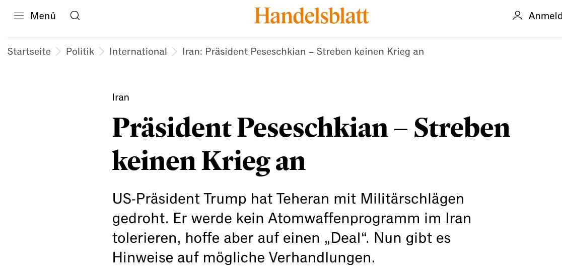 Inmitten wachsender Spannungen mit den USA hat der iranische Präsident Masoud Peseschkian nach Angaben der staatlichen Nachrichtenagentur Irna.deutlich erklärt, dass der Iran keinen Krieg wolle. Er rief zur Einleitung „diplomatischer Prozesse“ auf und unterstrich die Notwendigkeit von Verhandlungen. Dabei soll es insbesondere um Gespräche über Irans Atomprogramm gehen. Die Äußerungen kommen vor dem Hintergrund verschärfter Drohungen aus Washington. US-Präsident Donald Trump hatte jüngst den Druck auf den Iran erhöht und weitere militärische Verstärkungen in die Region geschickt. Irans Außenminister Abbas Araghtschi betonte, Teheran sei zwar offen für Verhandlungen, werde aber seine Verteidigungs- und Raketenprogramme nicht zur Disposition stellen. Er warnte zugleich, dass ein militärischer Konflikt über einen bilateral begrenzten Krieg hinausgehen könnte.