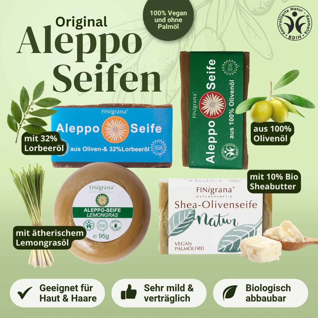 Ob mit 32 % Lorbeeröl, aus reinem Olivenöl, mit Bio-Sheabutter oder mit ätherischem Lemongrasöl – jede Aleppo-Seife ist ein Stück echter Naturtradition.