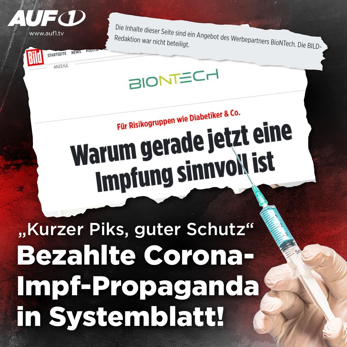 Das ist alles kein Zufall! In Deutschlands größtem Printmedium „Bild“ wird wieder groß für die Corona- und Grippeimpfung mit folgender Aufmachung geworben: „Warum gerade jetzt eine Impfung sinnvoll ist“. Die Panikmache und Nadelpropaganda fährt wieder hoch. „Das Coronavirus ist leider gekommen, um zu bleiben“ und „SARS-CoV-2 bedeutet für viele weiterhin ein Gesundheitsrisiko“, so die Angstmache gleich in den ersten Zeilen. Die Lösung ist in dem bezahlten Artikel des Bild-Werbepartners Biontech ganz klar. Der Piks: „Die Ständige Impfkommission rät daher zu einer jährlichen Corona-Schutzimpfung und empfiehlt nun auch einen Doppel-Piks gegen Corona und saisonale Influenza (Grippe).“