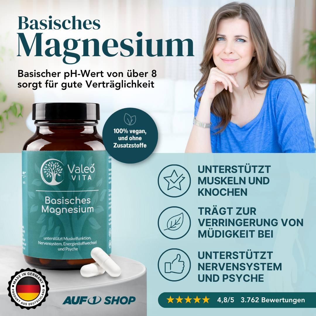 Valeo Vita Basisches Magnesium setzt auf Tri-Magnesiumdicitrat, eine hochwertige Magnesiumverbindung, die durch ihre einzigartige Form eine hohe Bioverfügbarkeit aufweist und basische verstoffwechselt wird. Diese Form enthält die doppelte Menge an elementarem Magnesium im Vergleich zu herkömmlichem Magnesiumcitrat und ist besonders gut verträglich.