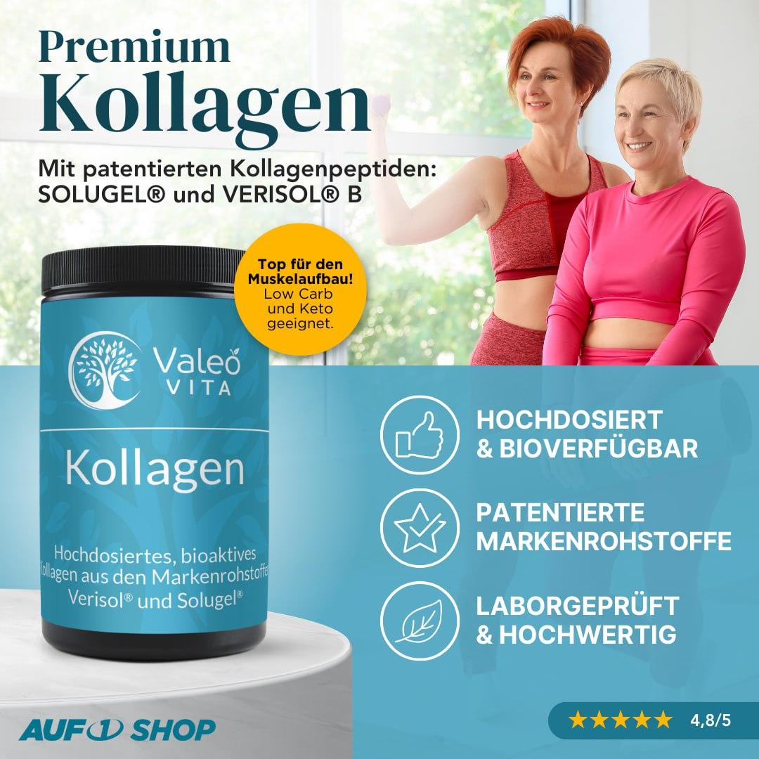 Kollagen von Valeo Vita ist gut verträglich, wird schnell vom Körper aufgenommen und lässt sich leicht in Wasser, Säfte und Kaffee einrühren. Das Pulver ist eiweißreich und gleichzeitig kohlenhydrat- und fettfrei, also auch ideal für eine Low Carb Ernährung.