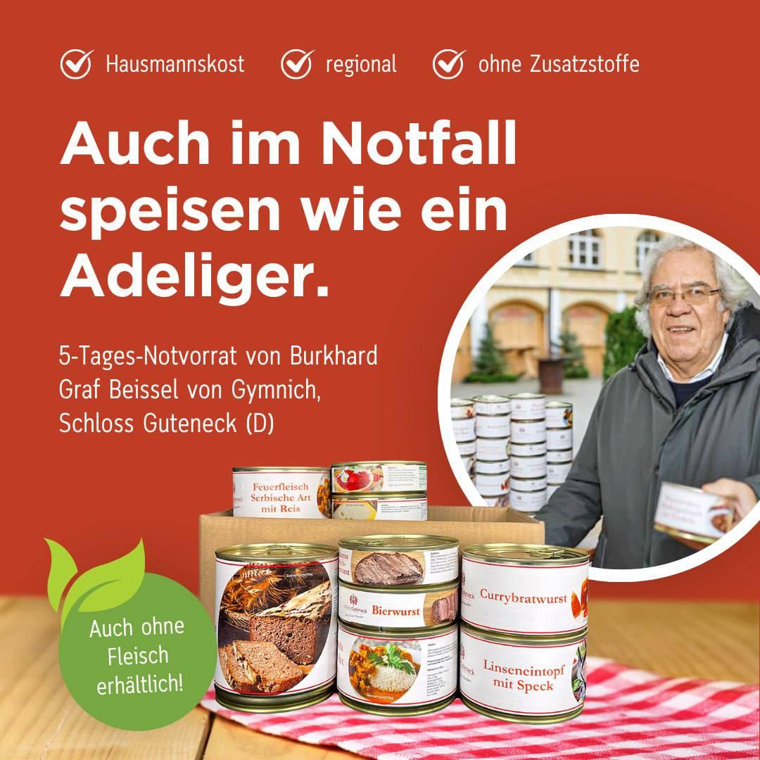 Ausgewogene, regionale Kost ist die optimale Krisenvorsorge für Sie, Ihre Familie und Ihren Betrieb. In Kooperation mit Burkhard Graf Beissel von Gymnich, Schlossherr im oberpfälzischen Schloss Guteneck, haben wir seine hausgemachten Notvorräte in unser Sortiment aufgenommen. Ein Paket ist eine 5-Tagesration für eine Person und umfasst 12 Dosen, verpackt in einem handlichen Karton. Mühelos tragbar und überall verstaubar. So praktisch und schmackhaft war Vorsorge für alle Fälle noch nie!