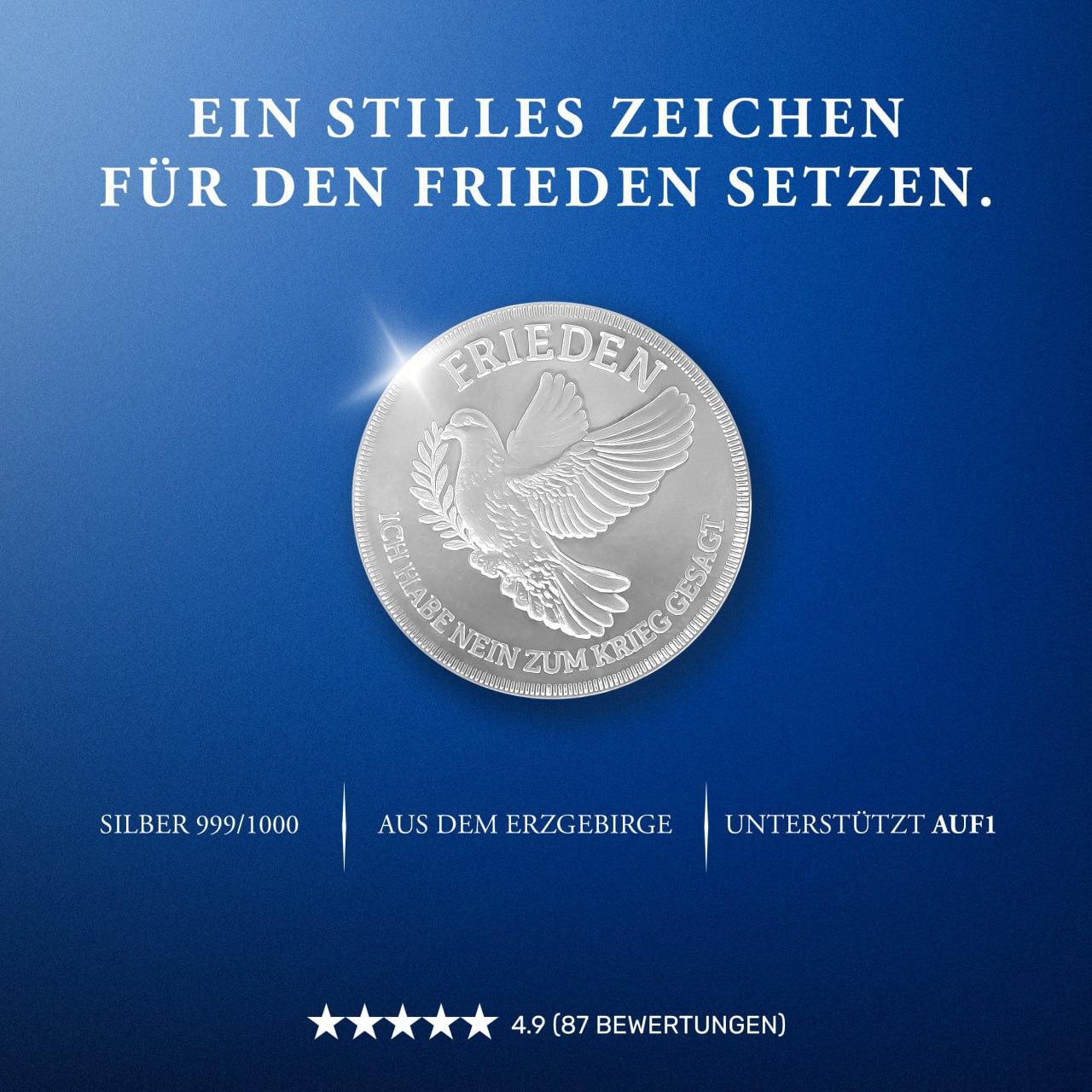 Die AUF1-Friedensmedaille mit der klaren Botschaft: „Ich habe Nein zum Krieg gesagt.“ Ein Ausdruck persönlicher Überzeugung und ein bleibendes Erinnerungsstück. Aus Feinsilber (999/1000) gefertigt im Erzgebirge.
