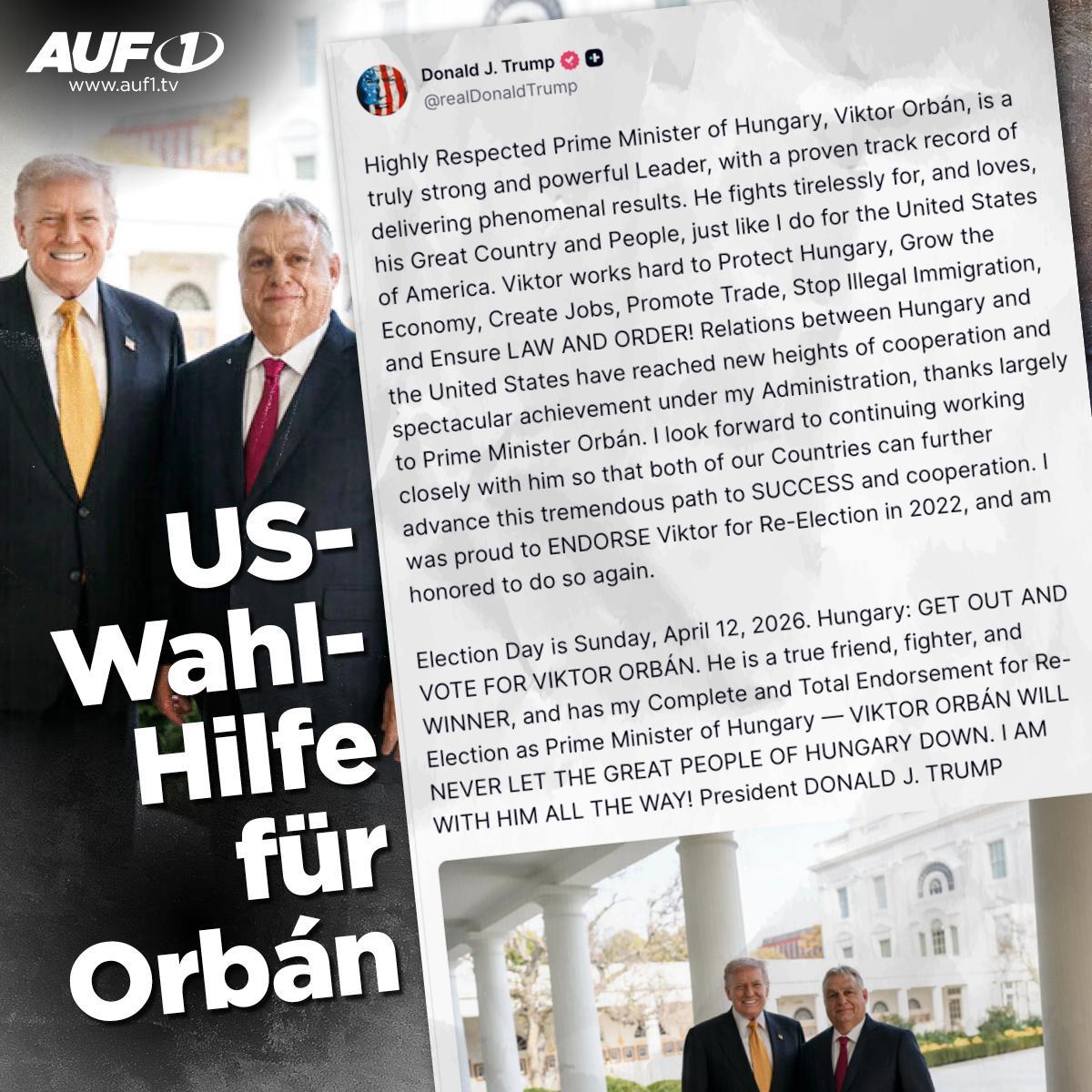 Wahl-Schützenhilfe bekommt Viktor Orbán nun auch von US-Präsident Donald Trump. Dieser postete auf seiner Social-Media-Plattform „Truth Social“ einen Wahlaufruf für den amtierenden ungarischen Premierminister Orbán: „Er ist ein wahrer Freund, Kämpfer und GEWINNER und hat meine vollständige und uneingeschränkte Unterstützung für die Wiederwahl zum Ministerpräsidenten von Ungarn“, schreibt Trump und fordert die Ungarn auf: „Geht hinaus und wählt Viktor Orban.“