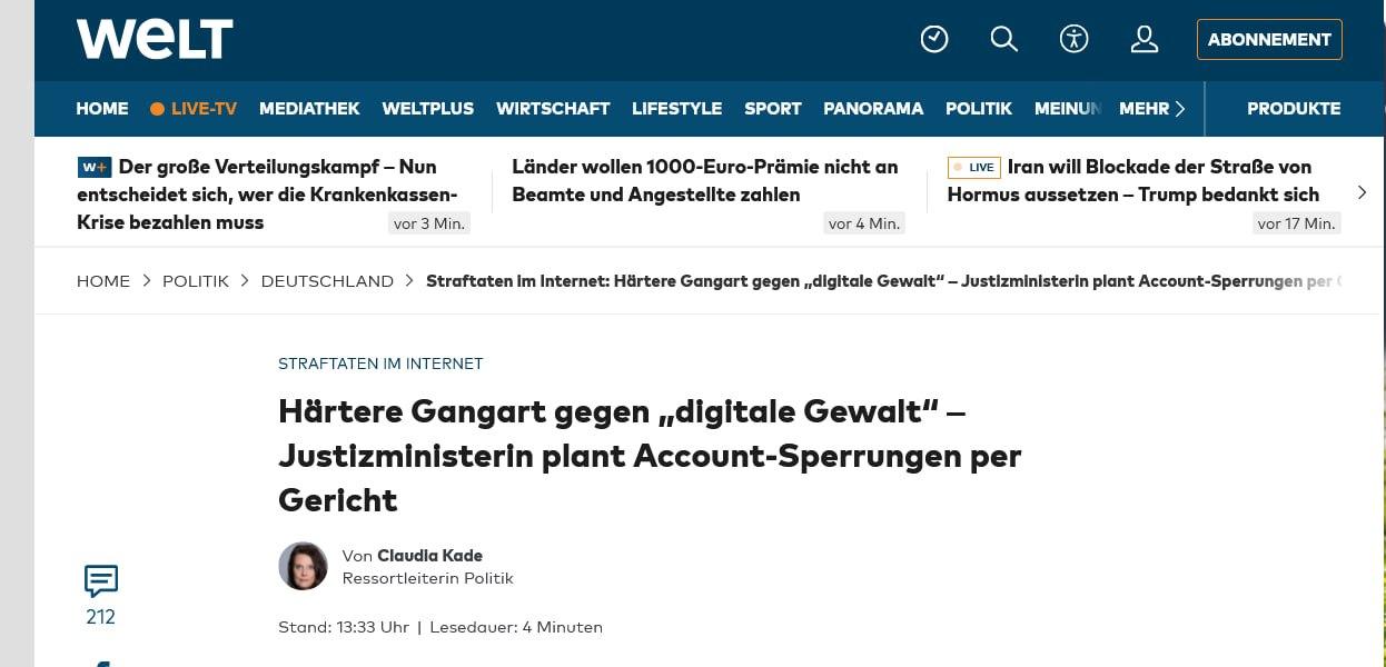 Angriff auf die Meinungsfreiheit: Die deutsche SPD-Justizministerin Stefanie Hubig will unliebsame Posts in Zukunft nicht nur löschen lassen. Vielmehr soll den Verfassern gleich das gesamte Profil gesperrt werden. Das geht aus einem Gesetzesentwurf zur Bekämpfung sogenannter digitaler Gewalt hervor, der der WELT vorliegt. Danach sollen etwa Betroffene von vermeintlicher „Hassrede“ die Sperrung des Absender-Profils einklagen können. Die endgültige Entscheidung soll dann einem Richter obliegen. Im Gesetzestext heißt es zur Begründung - Zitat - „Solche Sperrungen verhindern, dass über einzelne Accounts eines Internetdienstes fortwährend schwerwiegende Rechtsverletzungen begangen werden.“ Beobachter befürchten, dass die Furcht vor dem Verlust des eigenen Zugangs zu Facebook, Instagram und Co. dazu führt, dass Nutzer sich in ihrer Meinungsäußerung immer stärker selbst zensieren.
