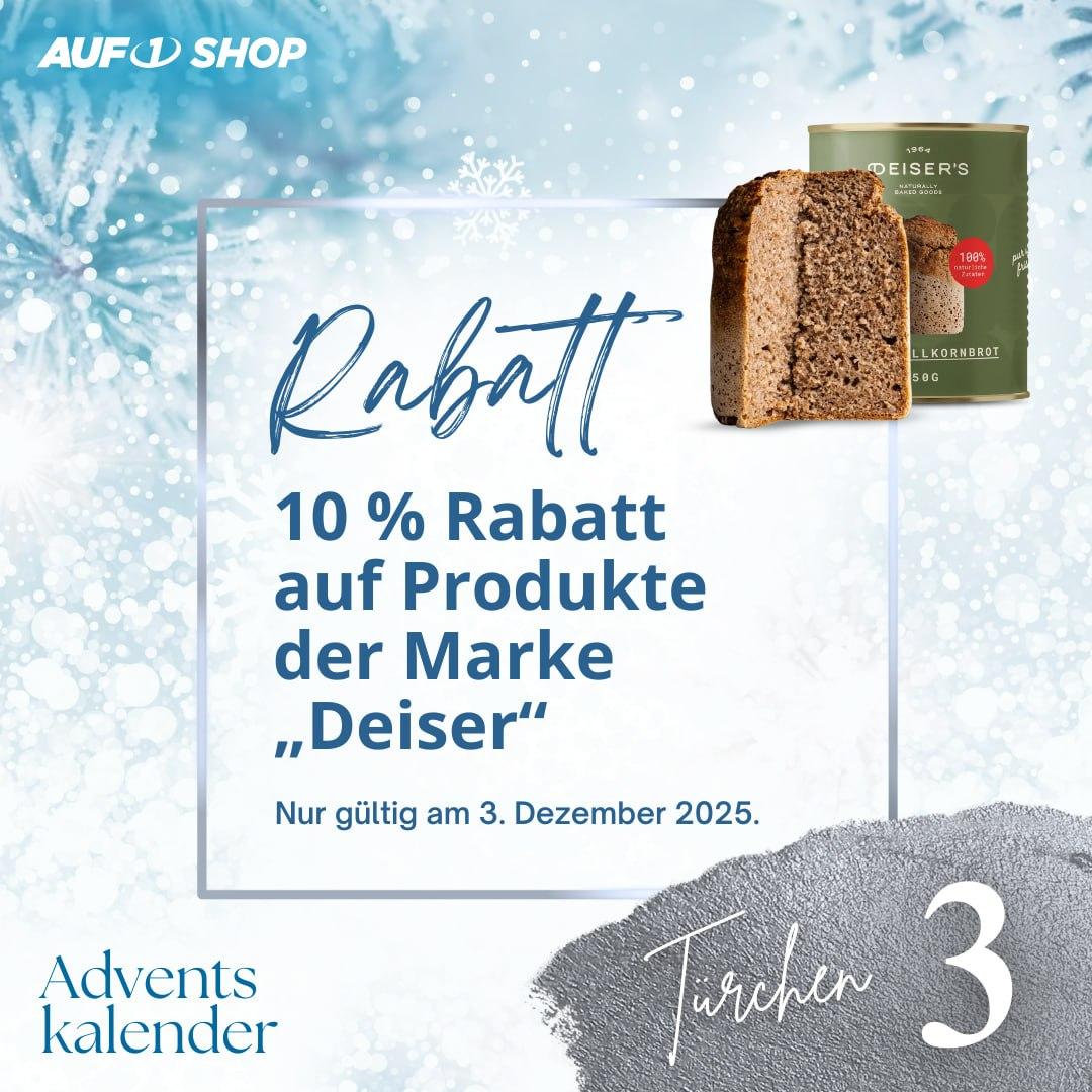 Auf alle Produkte der Marke „Deiser“ erhalten Sie heute 10 % Rabatt – vom legendären Dosenbrot bis zum saftigen Schokokuchen. Der Rabatt wird automatisch im Warenkorb abgezogen.