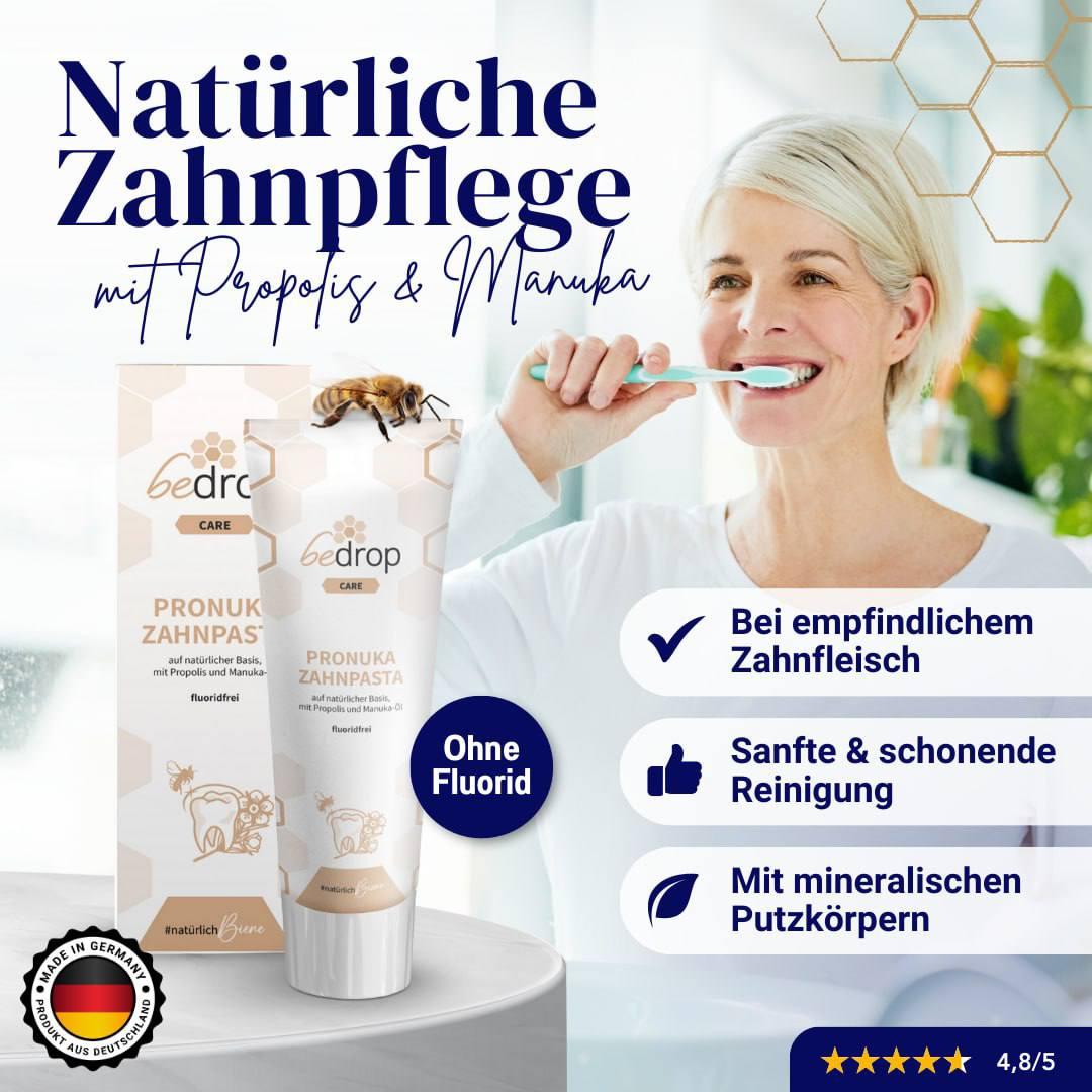 Die Pronuka Zahnpasta mit mit Propolis und Manuka-Öl sorgt für sanfte Pflege und frischen Atem – ganz ohne Fluorid.