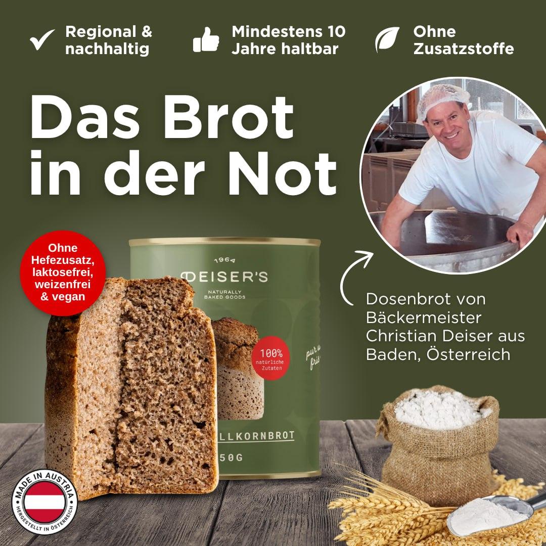 Ein Brot für alle (Krisen-)Fälle. 🍞 Extrem lange haltbares Dosenbrot – praktisch zu stapeln und somit ideal für die Krisen- und Notbevorratung oder ein Outdoor-Abenteuer. Von Bäckermeister Christian Deiser, Österreichs einzigem Dosenbrotbäcker.