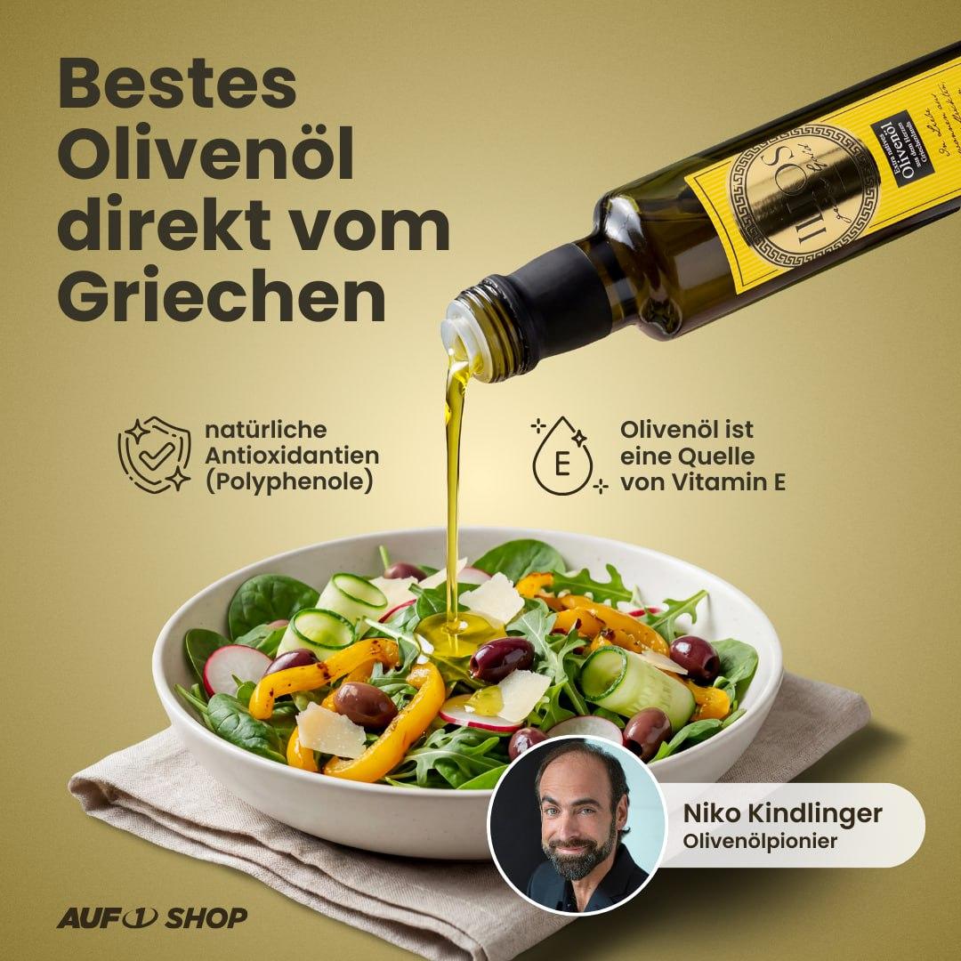 Olivenöl ist nicht nur ein Genuss für den Gaumen, sondern auch ein echtes Superfood. Das extra native Olivenöl von Olivenölpionier Niko Kindlinger-Stavropoulos enthält rund 70 % Ölsäure – eine einfach ungesättigte Fettsäure, die zur Aufrechterhaltung eines normalen Cholesterinspiegels beiträgt. Es ist zudem reich an natürlichen Antioxidantien (Polyphenolen).