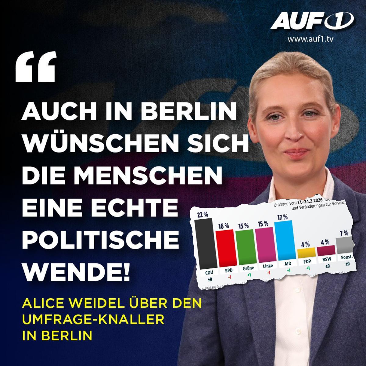 AfD-Chefin Dr. Alice Weidel zeigt sich auf X erfreut über die Umfrage. Sie schreibt: „Zum ersten Mal zweitstärkste Kraft in der Hauptstadt: Auch in Berlin wünschen sich die Menschen eine echte politische Wende!“
